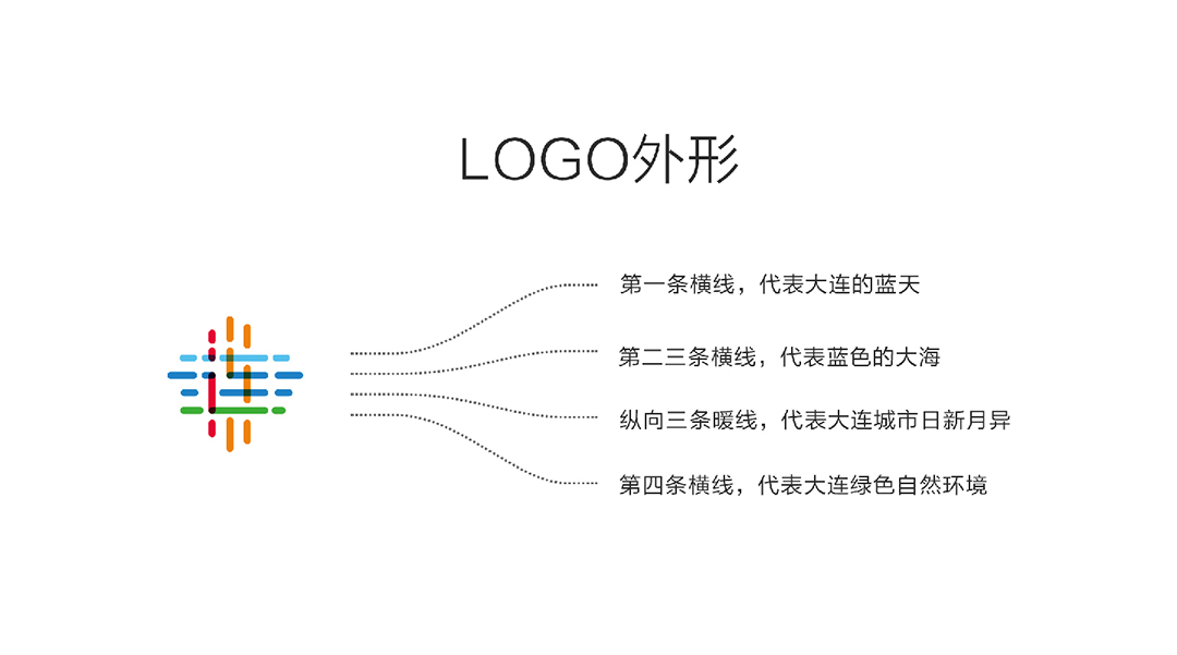 LOGO 设计不局限于几何形态,横向与纵向线条交织,展现大连多维度属性。四条横向线条象征大连自然景观与城市脉络。最上方线条代表天空,寓意城市广阔视野与开放胸怀;中间两条线代表大海,彰显大连作为东北亚国际航运中心的地理优势;最底部线条象征山川与绿色生态,体现其滨海旅游目的地的宜居环境。三条纵向线条则加深大连作为经济与文化流动中心的表现,象征金融、物流、航运等多领域纵深发展,体现大连在全球产业链中的枢纽作用。横纵线条巧妙结合,充分展示大连连接自然与人类活动的独特魅力。