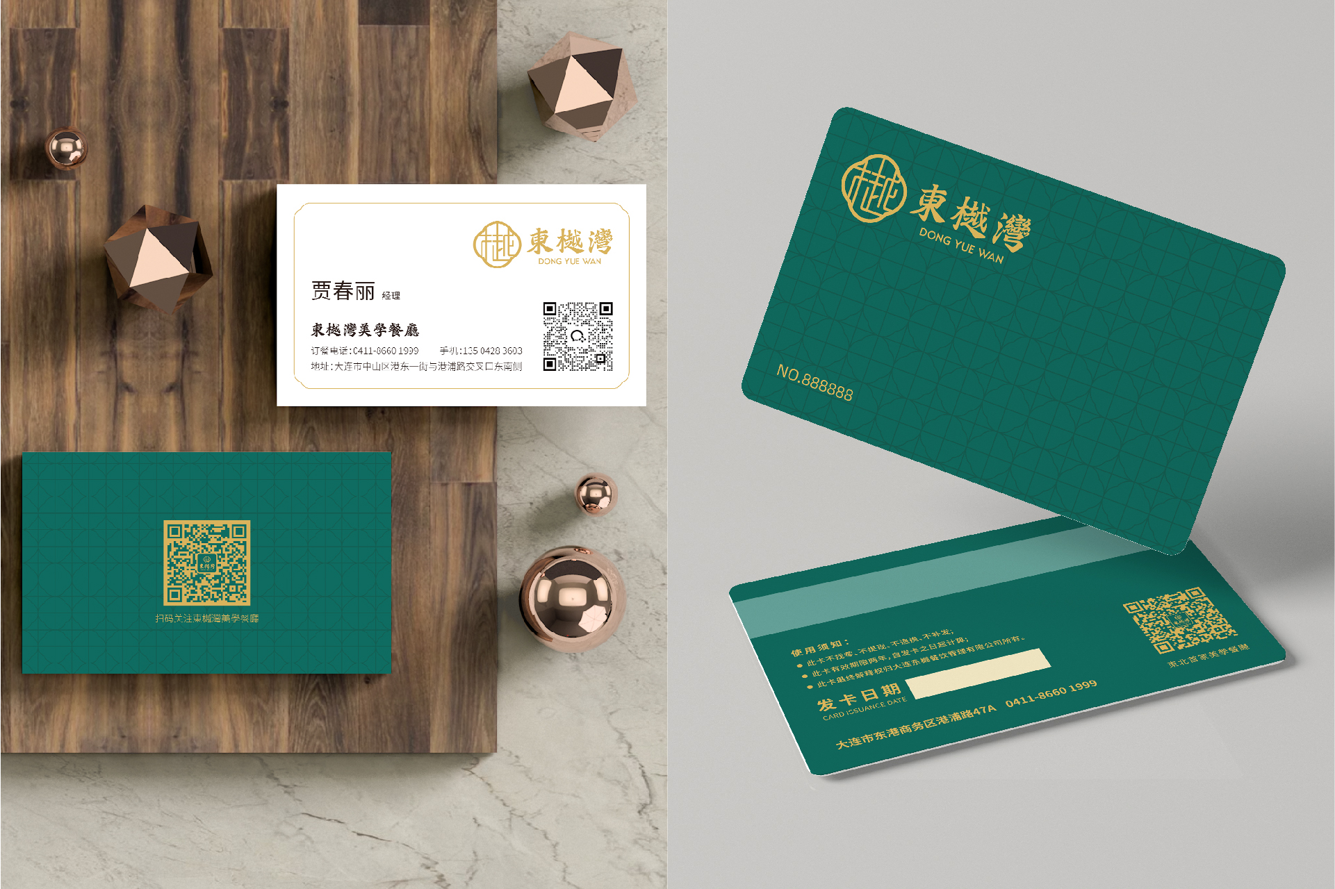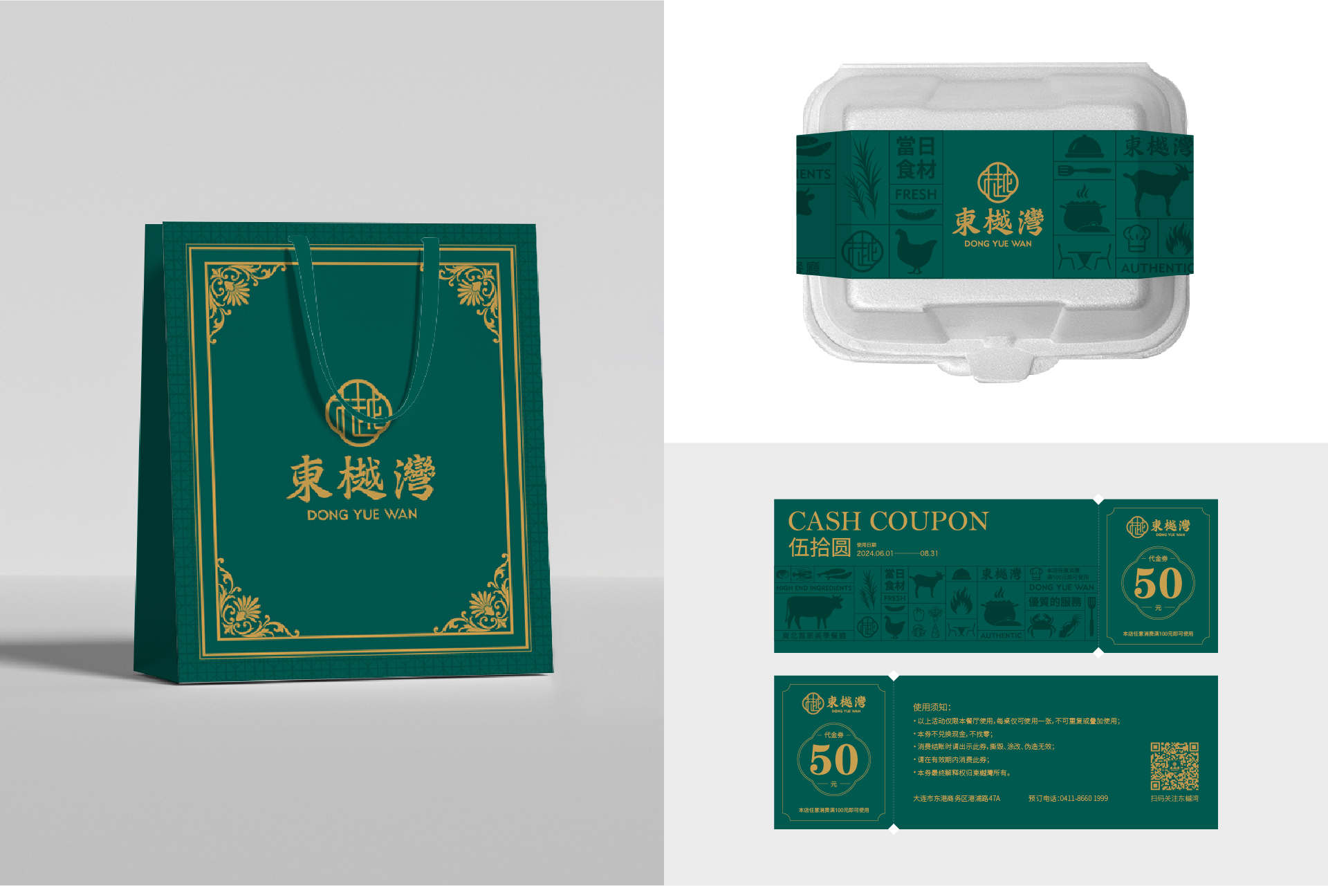 東樾灣美學餐廳的 LOGO 设计巧妙融合传统文化元素与现代设计理念,通过铜钱纹样、 “樾” 字以及绿金色彩搭配,传递财富、自然、福泽与奢华等多重寓意,从视觉设计延伸至空间体验,全方位塑造了餐厅独特的品牌形象,成为连接顾客与餐厅文化内涵的重要纽带。