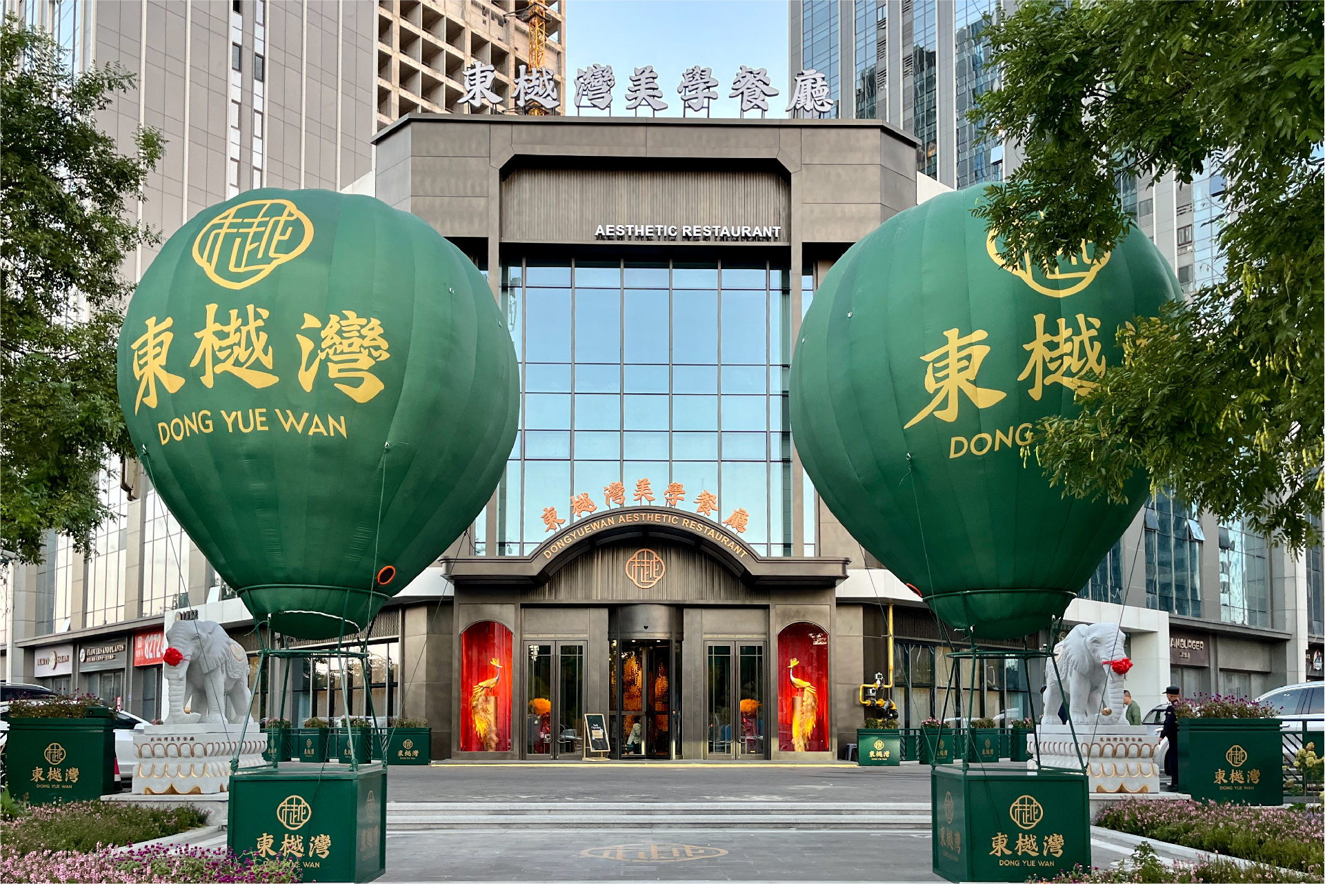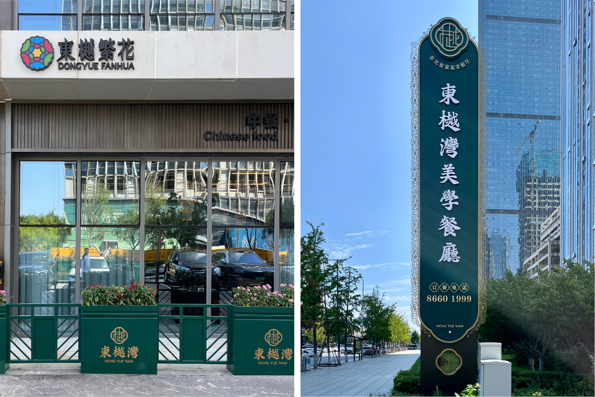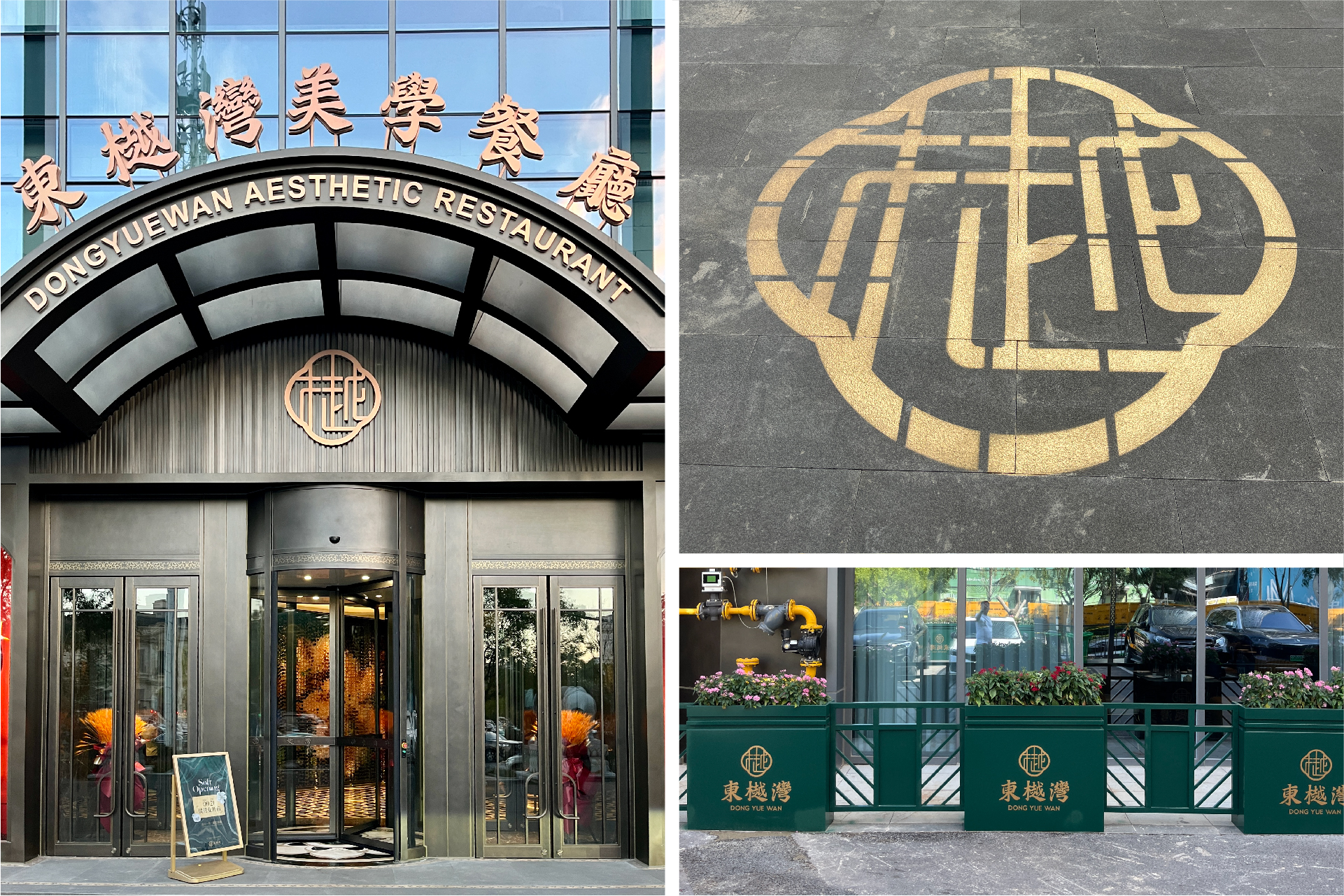 从视觉设计到空间体验的延伸 :東樾灣餐厅的 LOGO 影响不仅局限于视觉层面,还贯穿于空间设计与品牌理念之中。门头上醒目的绿色与金色标志成为视觉焦点,吸引顾客。内部装饰中,LOGO 元素巧妙融入地面金色钱纹图案、餐桌金色边饰、墙面绿金搭配等细节,彰显品牌独特性与设计完整性。餐具设计也延续 LOGO 色彩理念,金色餐具搭配绿色桌布与摆件,使顾客在用餐时感受品牌文化氛围,加深对品牌形象的认知,让用餐成为富有文化意义的仪式感体验。