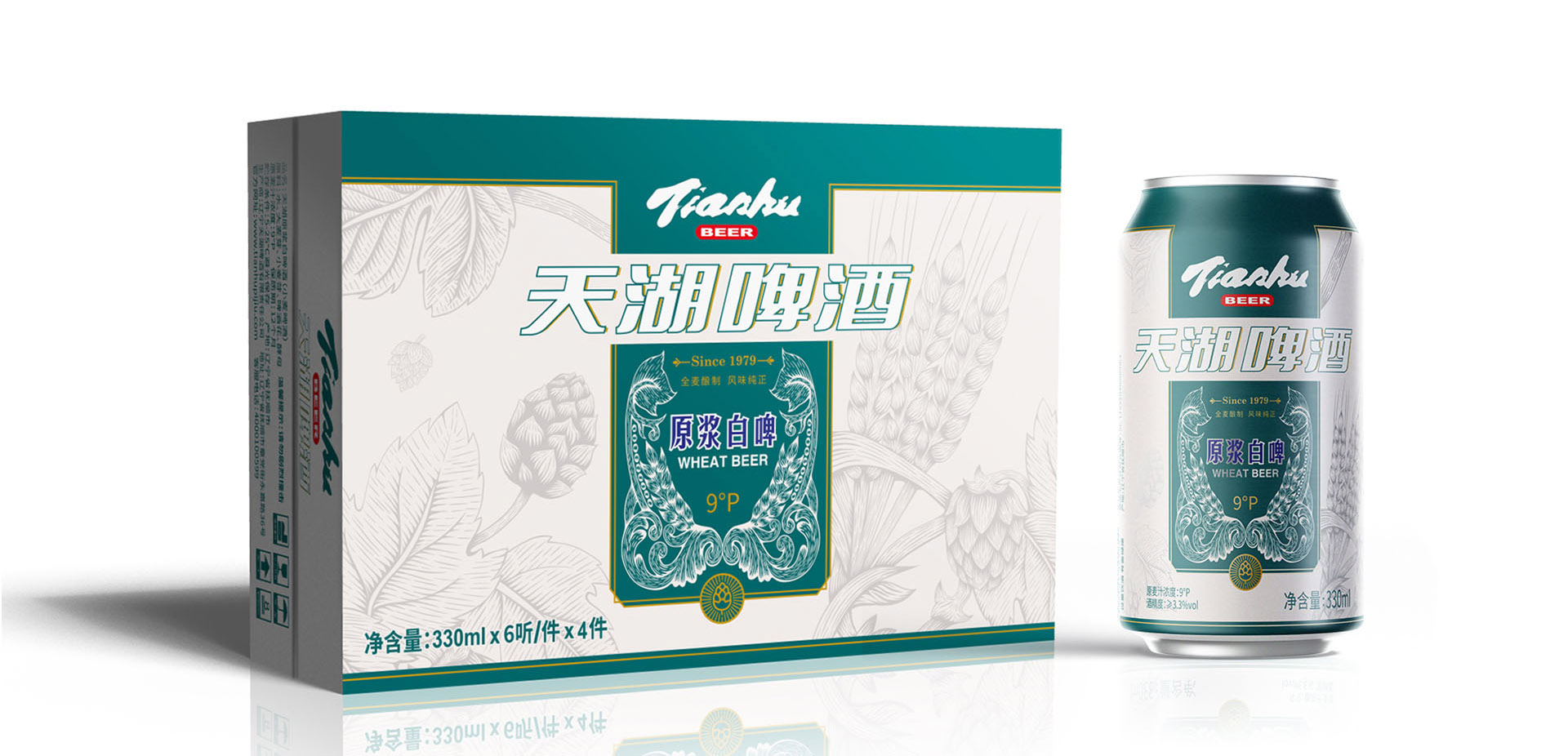 白啤,起源于中世纪的欧洲。故包装的整体风格以古典雅致为主,将传统线描的表现形式和偏现代的设计手法相融合去体现产品独有的属性。在画面元素的选择上将具有欧洲特征的花纹与拥有啤酒属性的麦芽和啤酒花为基础进行绘制,并将品牌内容和产品品名与其贯穿组合。两者的结合将品牌元素与产品属性得到充分的体现。充分的诠释了天湖啤酒卓越品质和精益求精的品牌理念。
