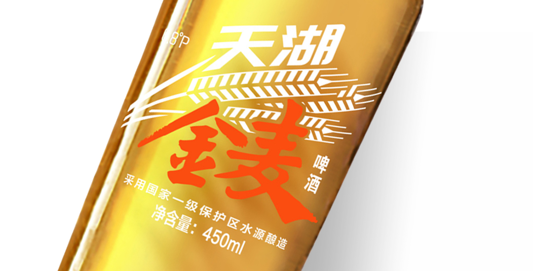 包装主视觉图案运用了两种设计语言,是现代与传统的融合。主视觉创意来源于品名“天湖金麦啤酒”,为突出这一卖点,通过现代设计手法将麦穗扁平化,与天湖字样有一个动势的体现,“金麦”两字则运用了中式传统设计语言,这两者的有机结合既强调金麦这一卖点也增强了产品的辨识度和品质感。
