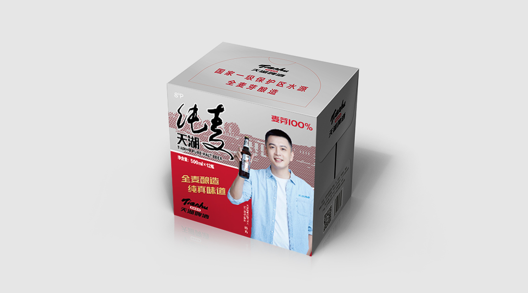 2022年,辽宁天湖啤酒有限责任公司邀请辽宁男篮主教练杨鸣作为“天湖啤酒”的代言人。对天湖纯麦啤酒外包装升级更新,在原有包装鲜明色块分割基础上欲代言人主形象与产品信息相组合,并辅以广告语“全麦酿造 纯真味道”。代言人的亮色与背景的红色、灰色形成强烈视觉反差。它们的结合清晰地传达了产品名称及卖点,同时也快速的拉近品牌和消费者的距离,提高了品牌知名度,方便其更好的融入市场。