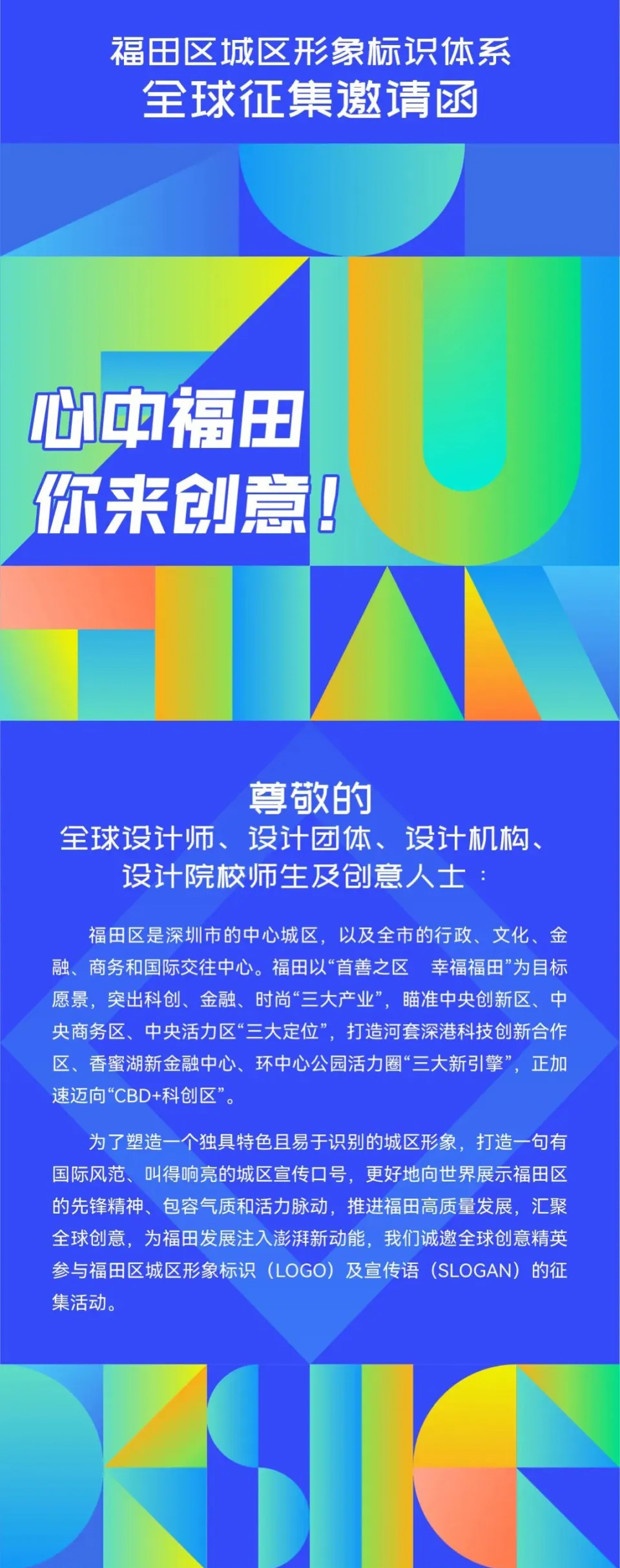 3. 宣传语(SLOGAN) :征集面向国际的英文宣传语,需反映福田城区特色优势,体现 “首善”“开放包容”“创新创意”“现代时尚”“活力城区”“人文福地” 等文化底蕴,要求积极向上、简洁响亮、感召力强,易读易记,便于国际传播。