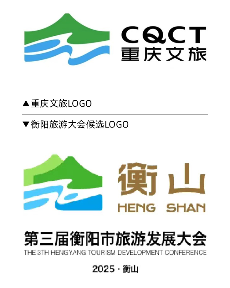 从投票页面展示的衡阳旅游大会候选 LOGO 来看,其与重庆文旅 LOGO 在整体造型上有诸多相似之处。二者均采用抽象的山水造型,主体部分由绿色山形与蓝色水波纹构成,传达出自然山水的意象。重庆文旅 LOGO 以简洁的线条勾勒出山峦起伏的形态,蓝色的水波纹则象征着重庆丰富的水资源。而衡阳旅游大会候选 LOGO 也运用类似的元素,上部的苍翠山形勾勒出紫盖峰的巍峨轮廓,下部灵动的水波纹融合了湘江与九观湖的意象,靛蓝曲线既象征文脉滋养,又暗喻生态价值,金色文字则彰显文旅产业的金色未来。虽然衡阳方面在细节上进行了调整,但从整体视觉效果来看,二者在创意表达和元素组合上存在高度相似性。