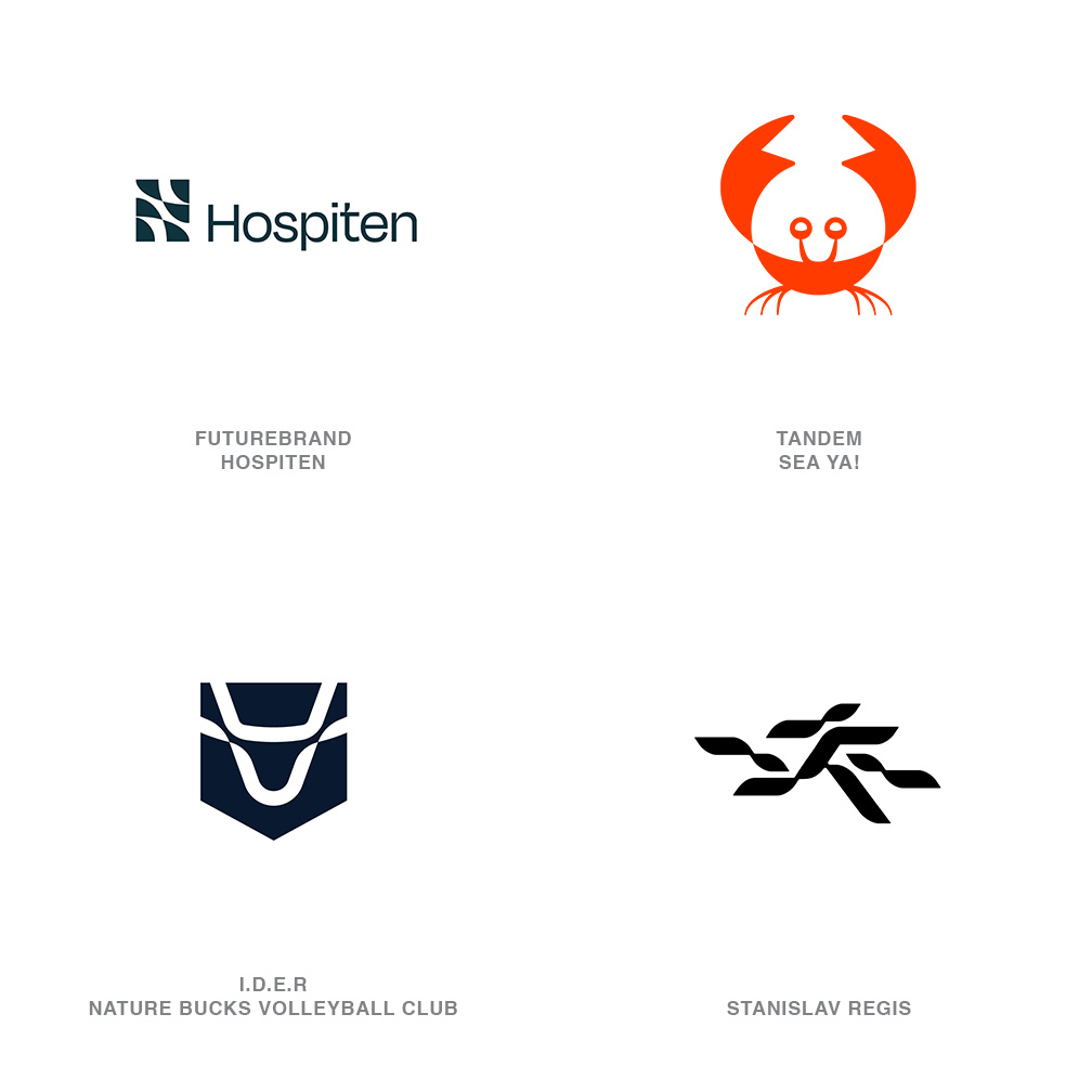 这一趋势的标志具有一种流畅的优雅感——半扭曲丝带般扫过的曲线,折叠自身,在中心渐细至无,然后在新的图形领域中重新浮现。这不仅仅是装饰;这是几何形状在为品牌真正发挥作用。这些交错线条创造出新的正形填充区域,将简单的形状转化为层层叠加的视觉故事。有时它们是抽象的,有时是具象的(比如螃蟹或跑步者),但它们都共享着负空间、运动和张力的动态互动。它们传达出敏捷性——转折、灵活调整和融合的能力 —— 并且表明品牌能够在不遗漏任何节拍的情况下,从一个焦点转移到另一个焦点。