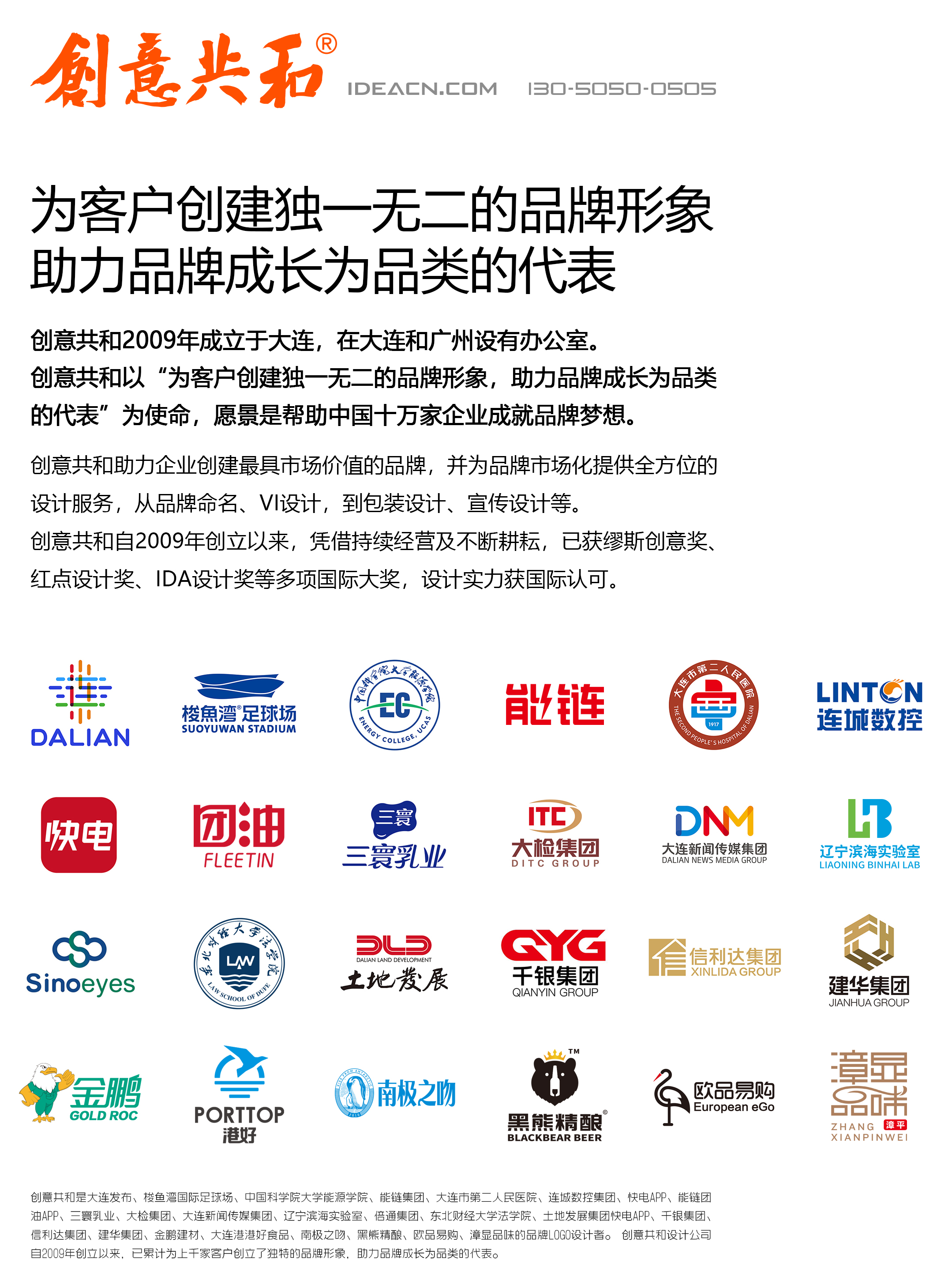 商业品牌全案设计方面,于明龙带领创意共和设计团队完成了上市公司连城数控品牌重塑设计、能链集团品牌重塑设计、快电APP品牌设计、团油APP品牌设计、三寰乳业品牌重塑设计、倍通数据集团品牌设计、大连检验检测认证集团品牌设计、土地发展集团品牌设计、信利达集团品牌设计、千银集团品牌设计、建华集团品牌设计等数十家集团企业商业设计项目。通过精准的品牌定位与创新的视觉表达,助力企业实现市场突破,提升品牌价值与市场竞争力。