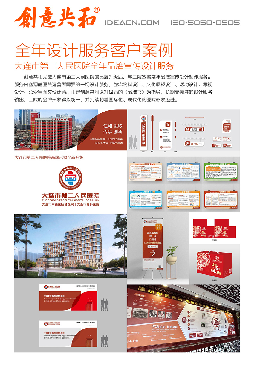 以大连市第二人民医院为例:创意共和先完成医院品牌升级,提炼“仁和进取?传承创新”的核心理念,构建涵盖LOGO、色彩、版式的《品牌书》;在此基础上,提供全年全维度设计服务——从文化展板的学术严谨性,到活动物料的场景适配性,从导视系统的功能引导,到公众号图文的传播属性,所有设计均以《品牌书》为标尺,最终让医院品牌朝“国际化、现代化”稳步迈进。这种“战略先行+长期落地”的模式,让品牌形象摆脱“碎片化”,形成持续的市场记忆。