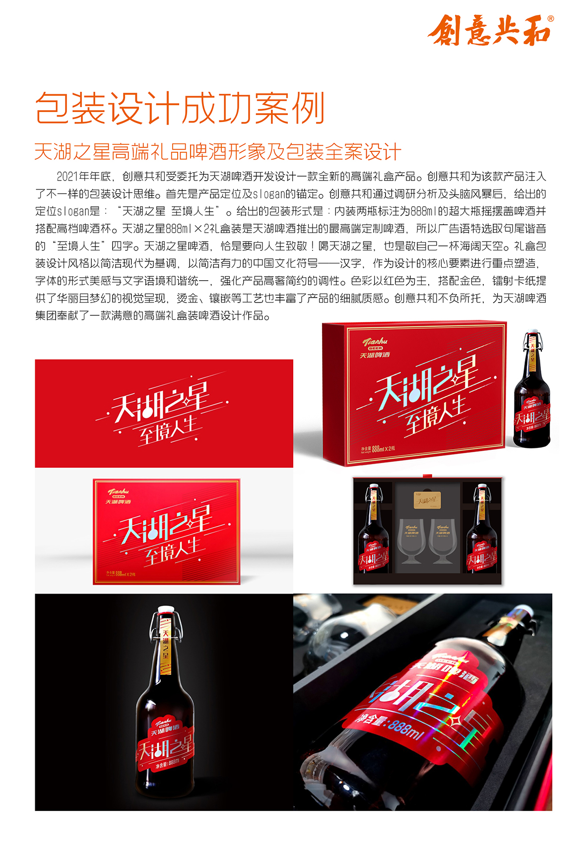 基于此,创意共和为 “天湖之星” 策划出产品Slogan“天湖之星 至境人生”,并制定了高奢简约的设计策略。包装采用红色与金色为主色调,红色象征着热情与活力,金色则彰显品质与奢华,两者搭配营造出高端大气的视觉效果。同时,在包装形式上,采用两瓶 888ml 超大瓶搭配高档酒杯的礼盒装设计,既满足了消费者在高端社交场合的饮用需求,又提升了产品的礼品属性。“天湖之星” 全新包装上市后,迅速在高端啤酒市场中崭露头角,成为消费者在高端聚会、礼品馈赠等场景中的热门选择,品牌知名度与美誉度大幅提升,成功助力天湖啤酒在高端啤酒市场占据一席之地。