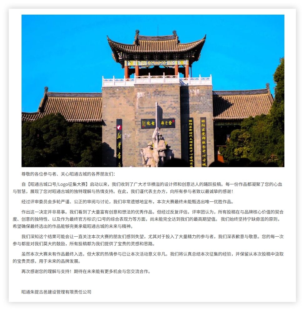 10 月 1 日,昭通古城公众号发布公告,称其口号与 Logo 征集大赛最终未甄选出唯一优胜作品。这场持续一年的征集活动,最终以 “宁缺毋滥” 的表述收尾,但网友们的质疑声浪,让活动背后的品牌公信力问题逐渐凸显。