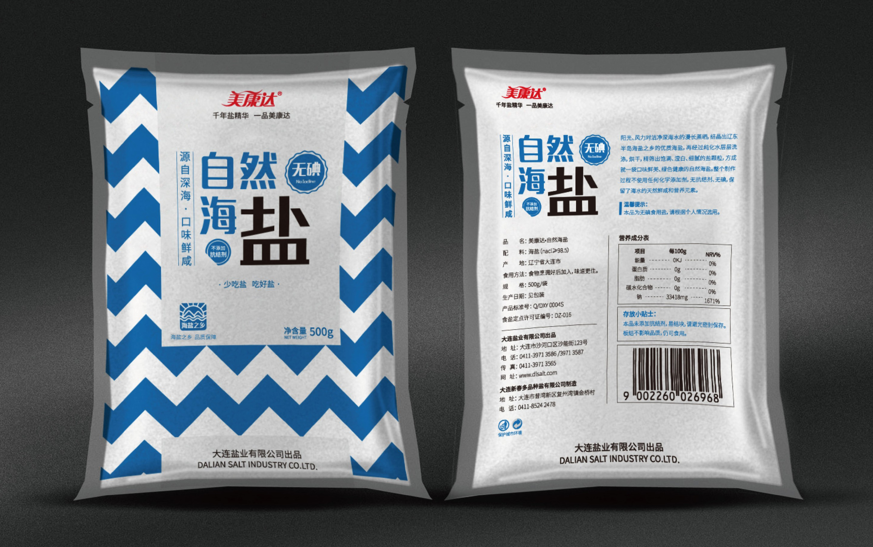 “烧盐”是一款主打健康与品质的盐产品。创意共和为其设计的包装以蓝白相间的波浪图案为主题,象征海水与自然,传递出产品的纯净与科技感。正面采用简洁的文字说明和品牌标识,背面则详细展示了产品的生产工艺和营养成分表,增强了消费者的信任感。