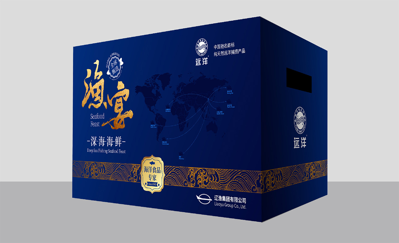 “远洋海鲜礼盒”是一款面向高端市场的海鲜礼品套装。创意共和为其设计的包装采用深蓝色为主调,搭配金色线条与世界地图元素,传递出品牌的全球化视野和高端定位。包装上印有“中国驰名商标”标识,进一步提升产品的权威性和礼品属性。