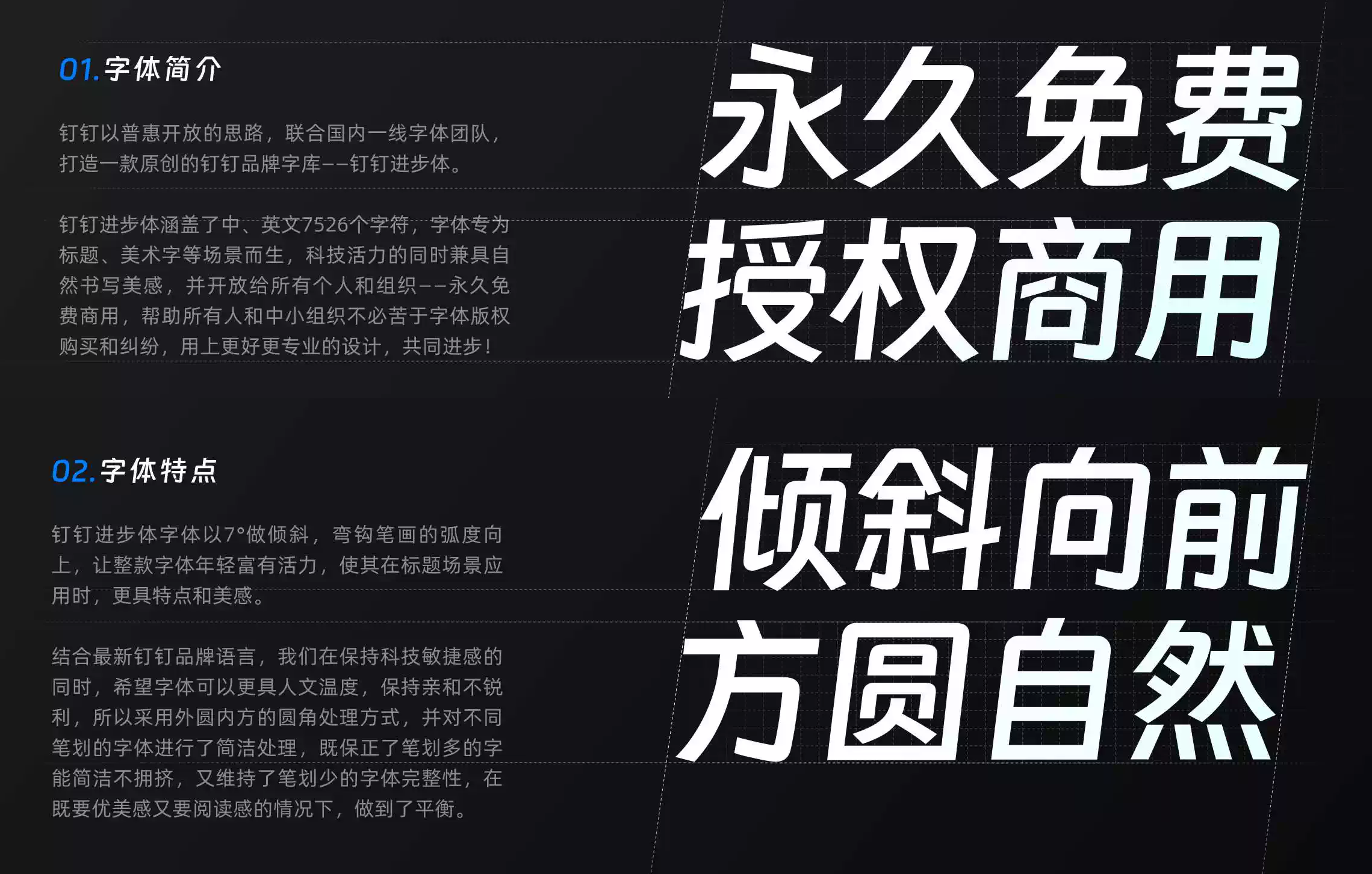 钉钉进步体下载地址(点击),现代简约风格突出。笔画流畅利落,结构清晰规整,给人积极向上、专业高效的感觉,偏向商务风却不失活力。标设网认为,其适用于科技企业商标、办公软件LOGO、商务服务品牌标识等场景,能彰显品牌的专业形象,且免费商用适配企业各类商业文档与推广物料。